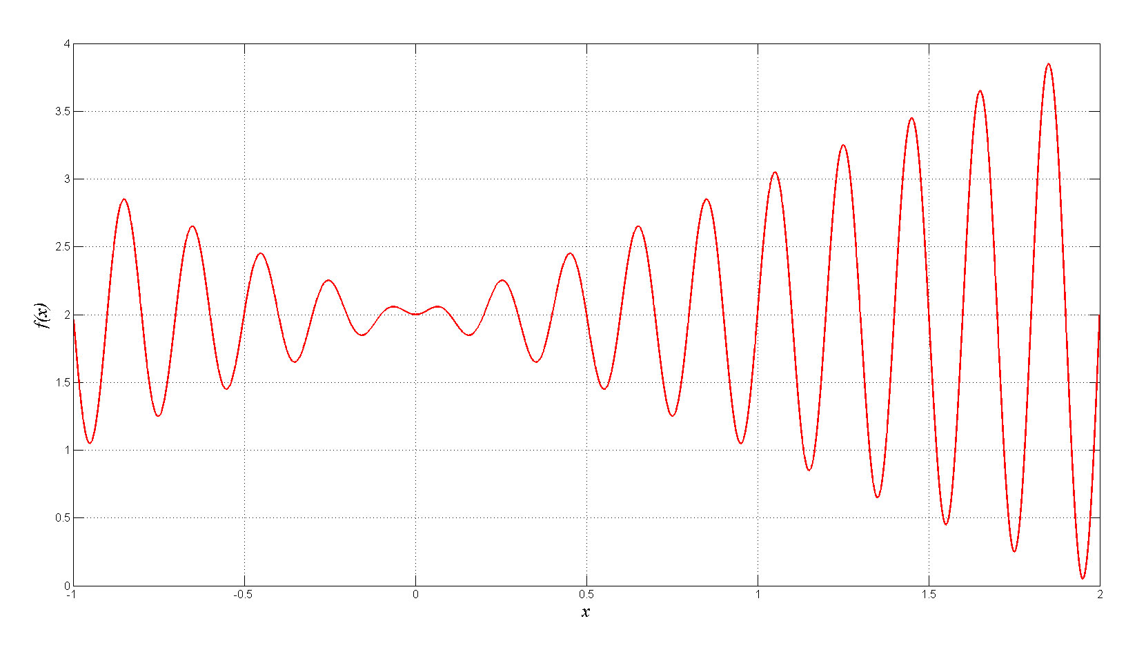 $$f(x)=x \cdot \sin(10 \pi x) + 2.0$$