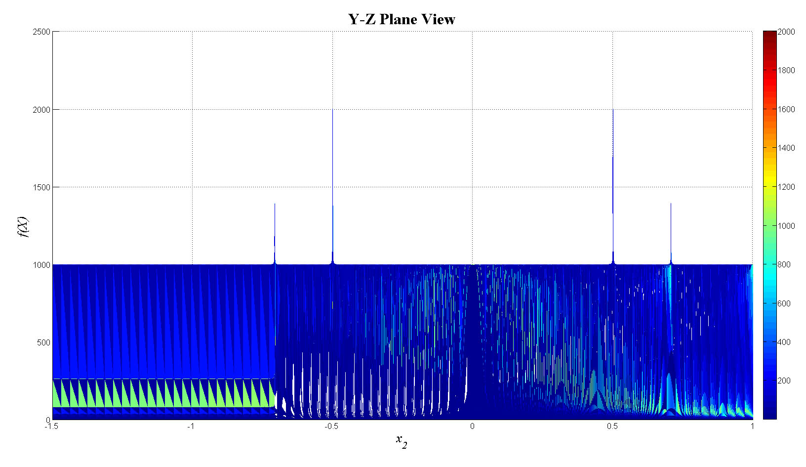 mesh(x1,x2,f_tot);view(0,0);colorbar;set(gca,'FontSize',12);