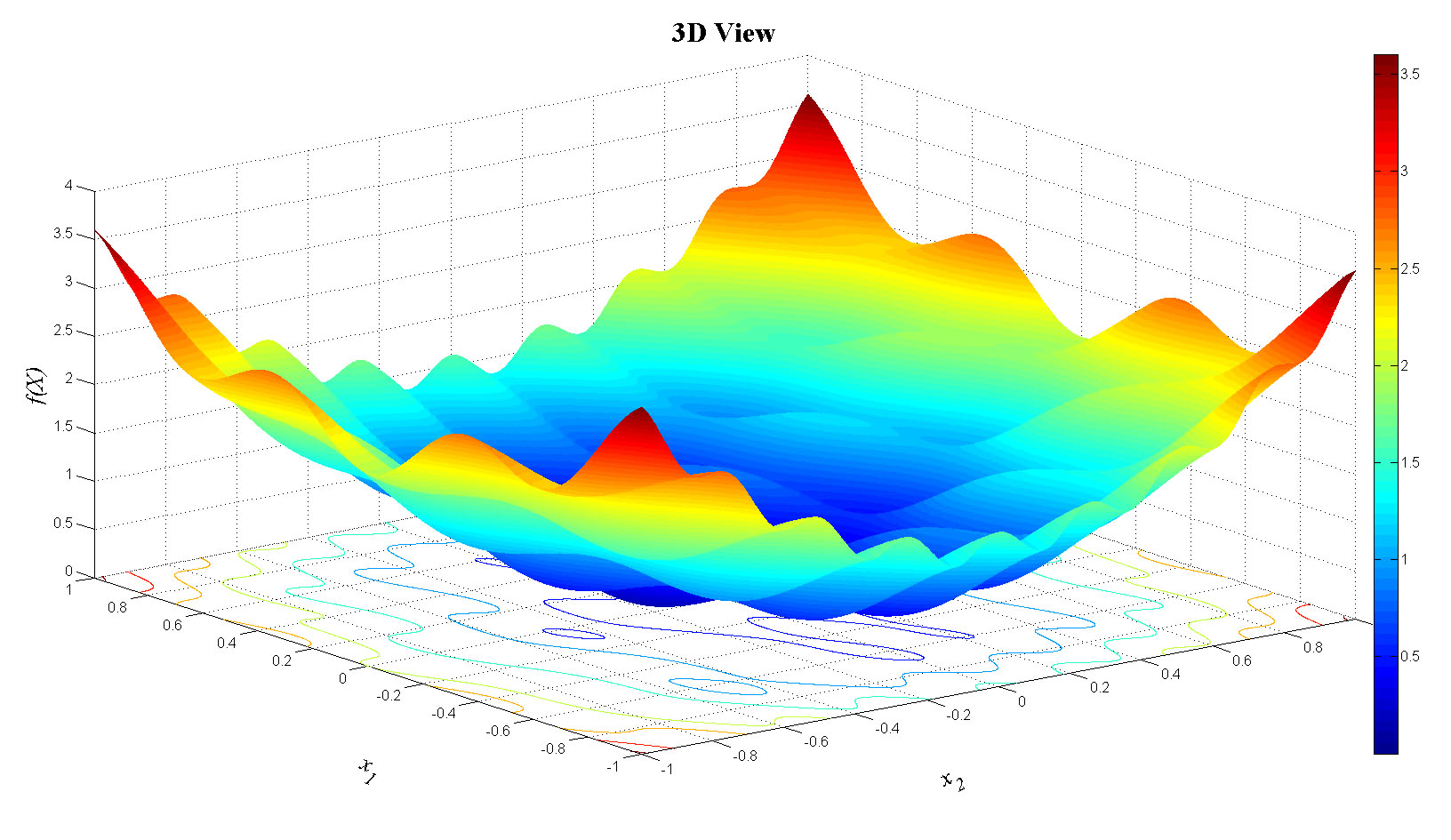 $$f(X) = x^2_1+2x^2_2-0.3\cos\left(3 \pi x_1+4 \pi x_2\right) \left[\cos\left(4 \pi x_2\right)\right]+0.3$$