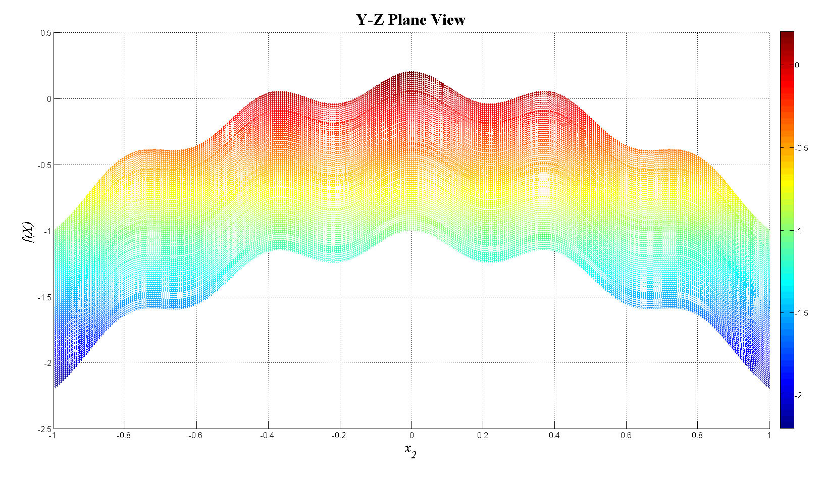 mesh(x1,x2,fn_tot);view(0,0);colorbar;set(gca,'FontSize',12);