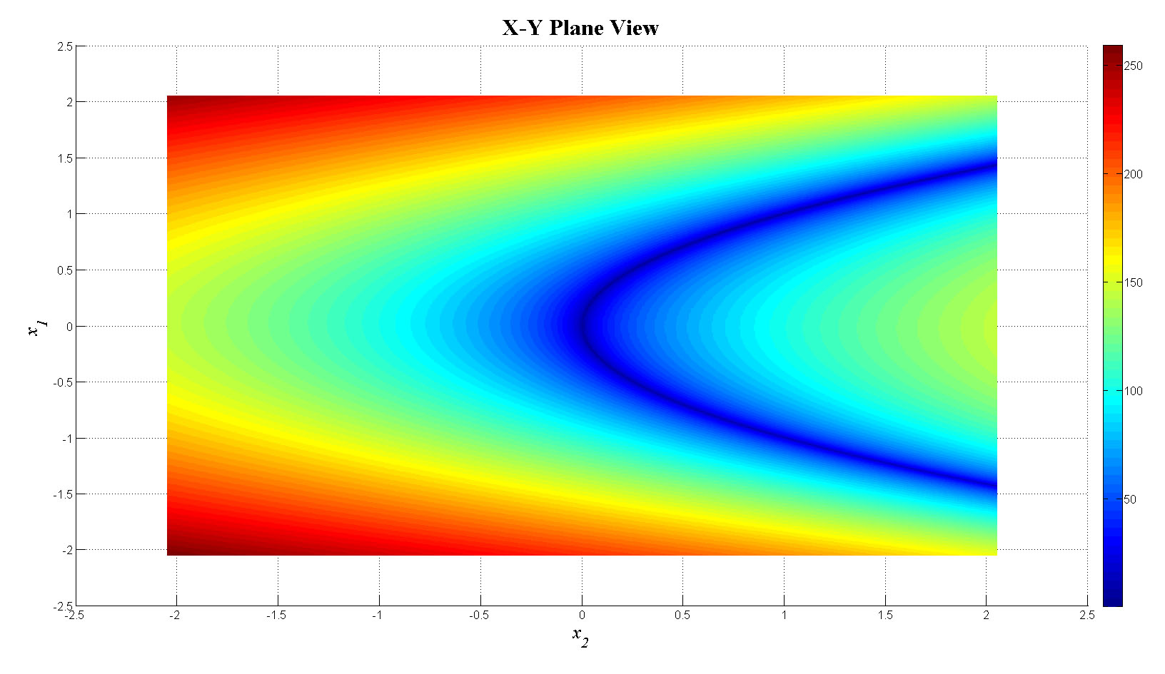 mesh(x1,x2,f_tot);view(0,0);colorbar;set(gca,'FontSize',12);
