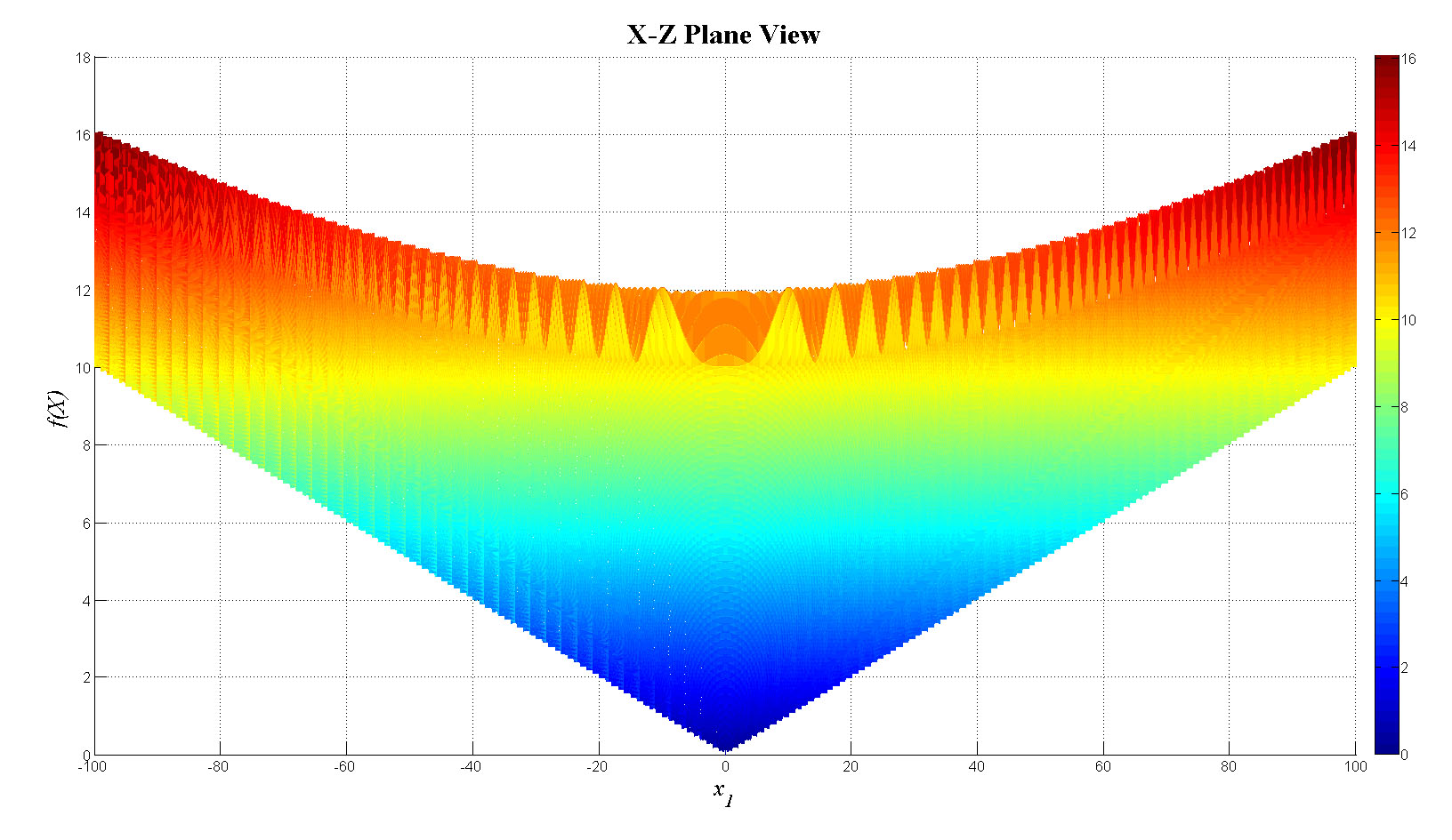 $$f(X)=1-\cos\left(2\pi \left \| x \right \|\right)+0.1\left \| x \right \|$$