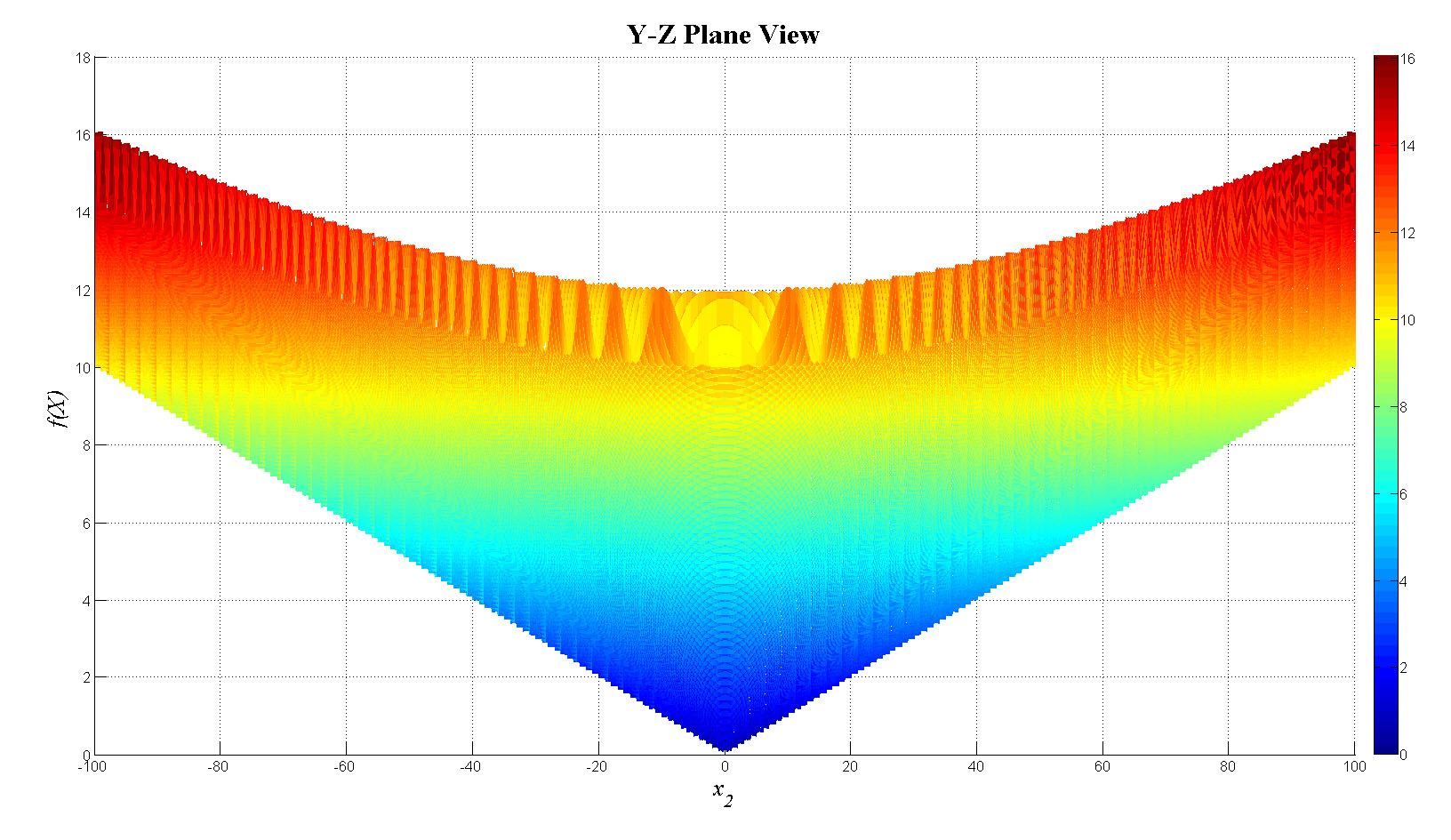 mesh(x1,x2,fn_tot);view(0,0);colorbar;set(gca,'FontSize',12);