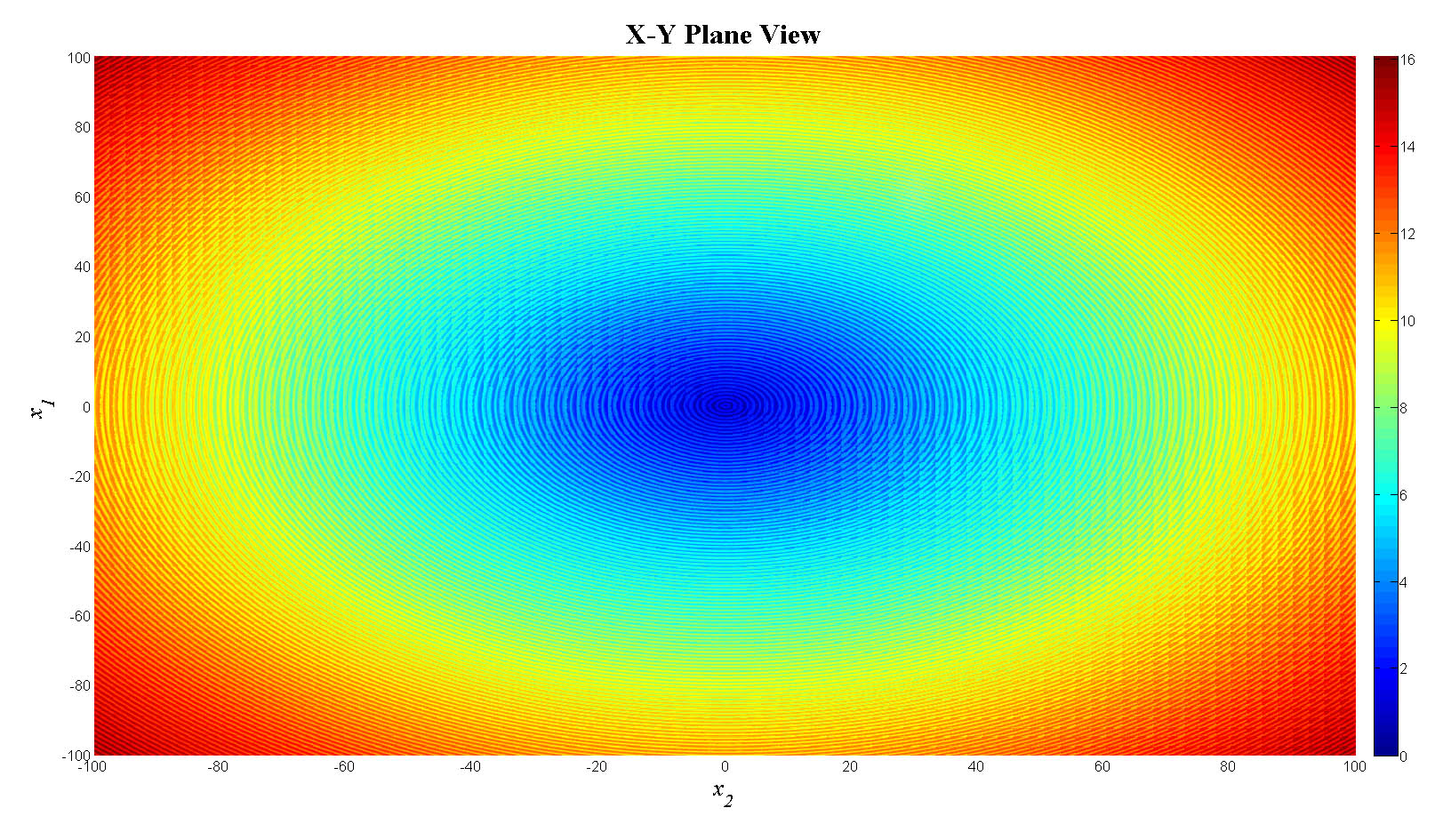 mesh(x1,x2,fn_tot);view(90,0);colorbar;set(gca,'FontSize',12);
