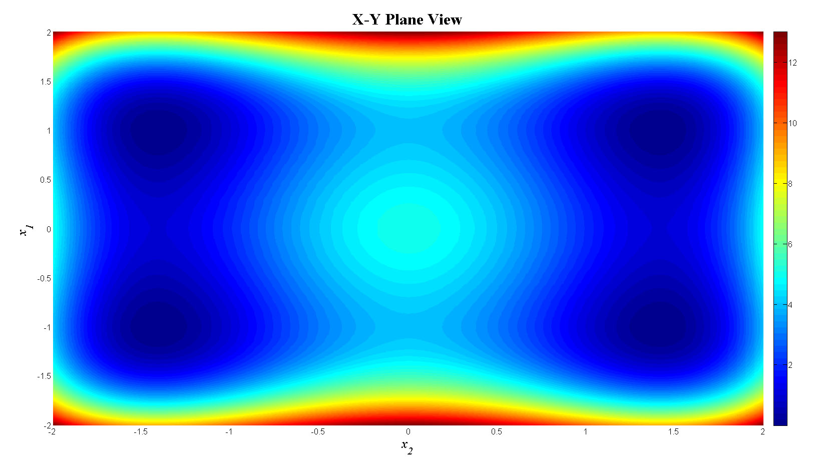 mesh(x1,x2,fn_tot);view(90,0);colorbar;set(gca,'FontSize',12);