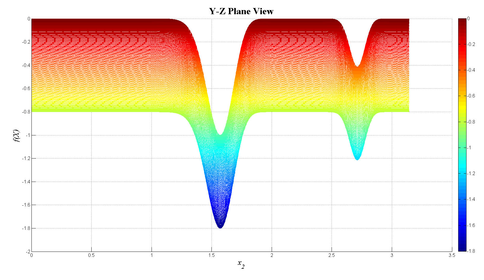 mesh(x1,x2,fn_tot);view(0,0);colorbar;set(gca,'FontSize',12);
