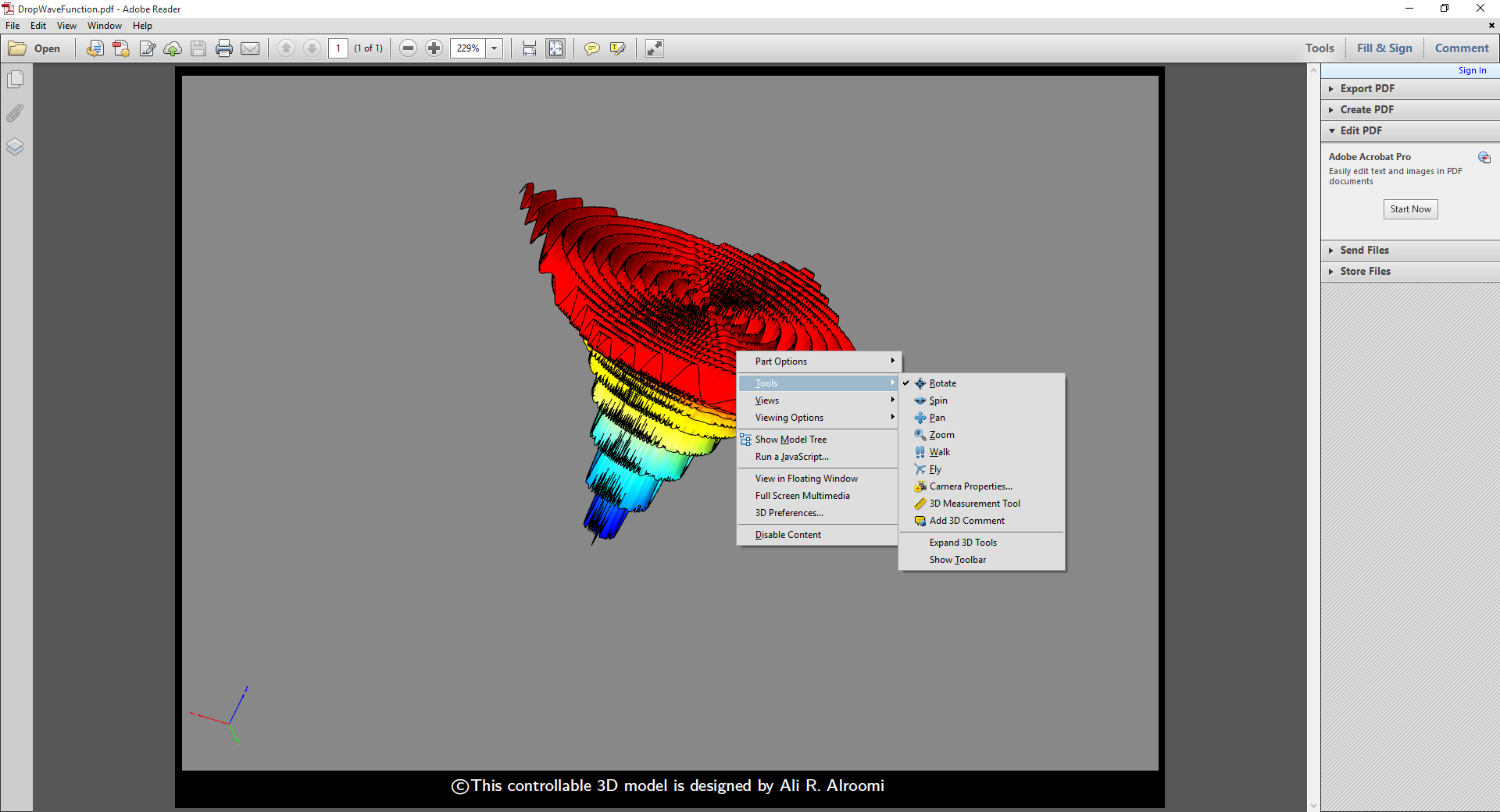 We have embedded a huge number of pdf files that have controllable 3D plots (with .u3d objects), where the users have the ability to rotate, spin, pan, fly, zoom-in, zoom-out, cut specific planes, etc, as shown below for the Drop-Wave Benchmark Function: