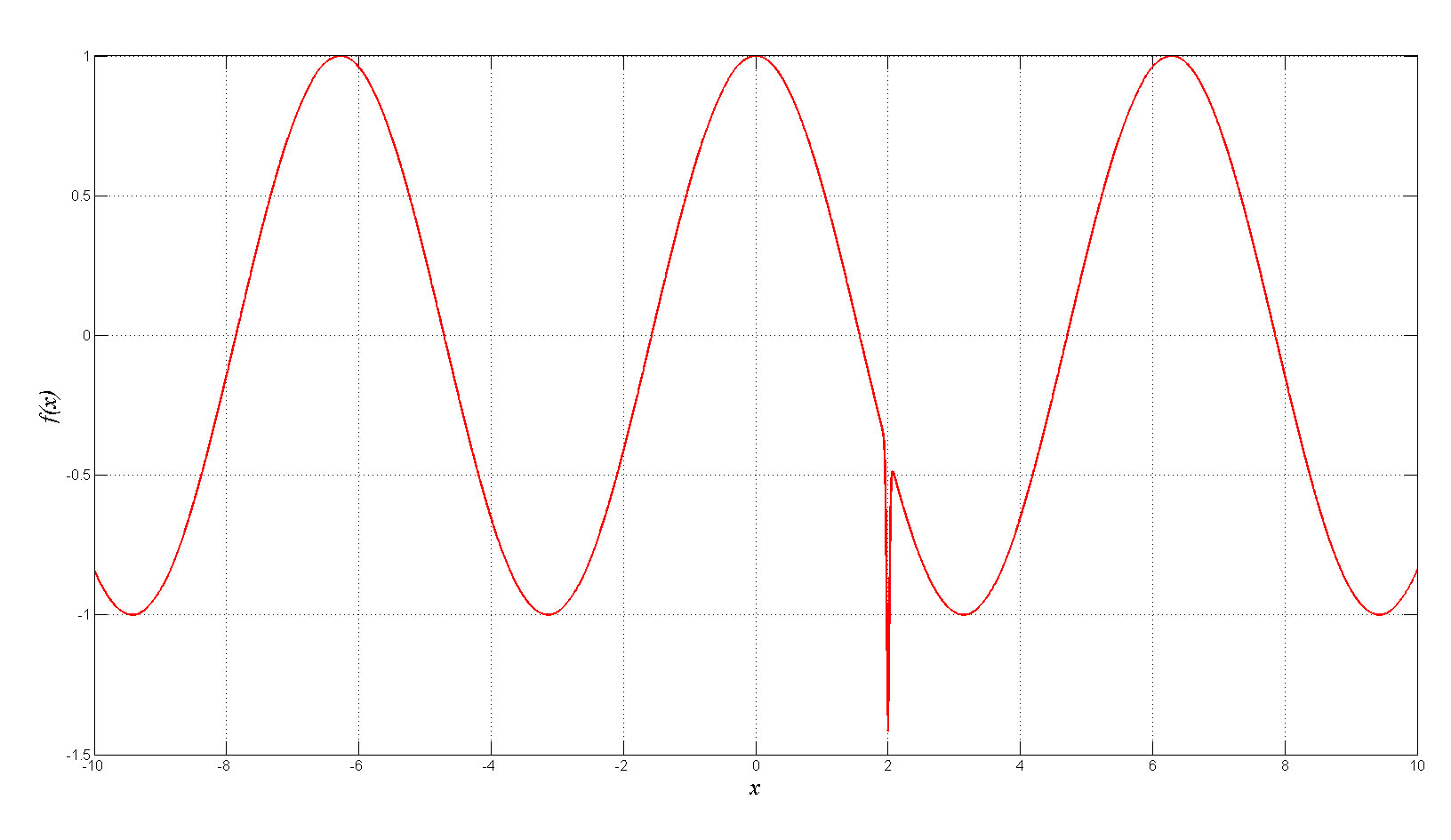 f(i)=cos(x(i))-exp(-1000*((x(i)-2)^2));