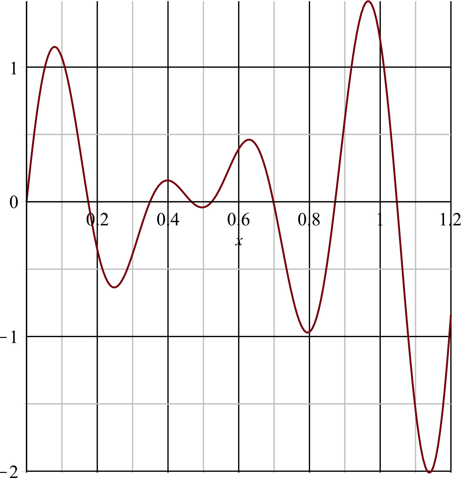 plot(x,f,'r','LineWidth',2);grid;set(gca,'FontSize',12);axis([0 1.2 -2.2 1.7]);