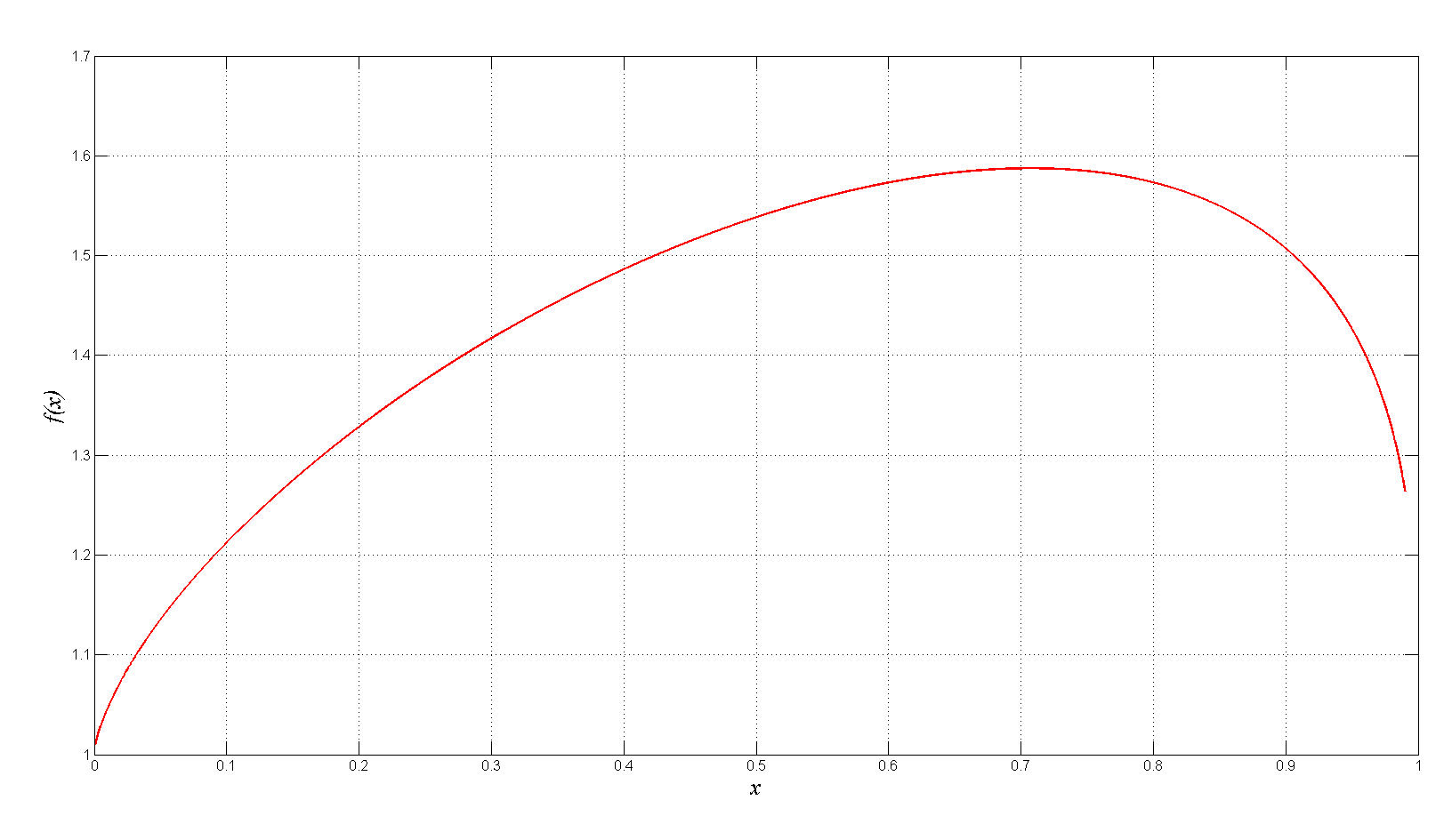 \(\bullet\) \(x^*=\frac{\displaystyle 1}{\displaystyle \sqrt{2}}\) (determined by us using MapleSoft 2015)
