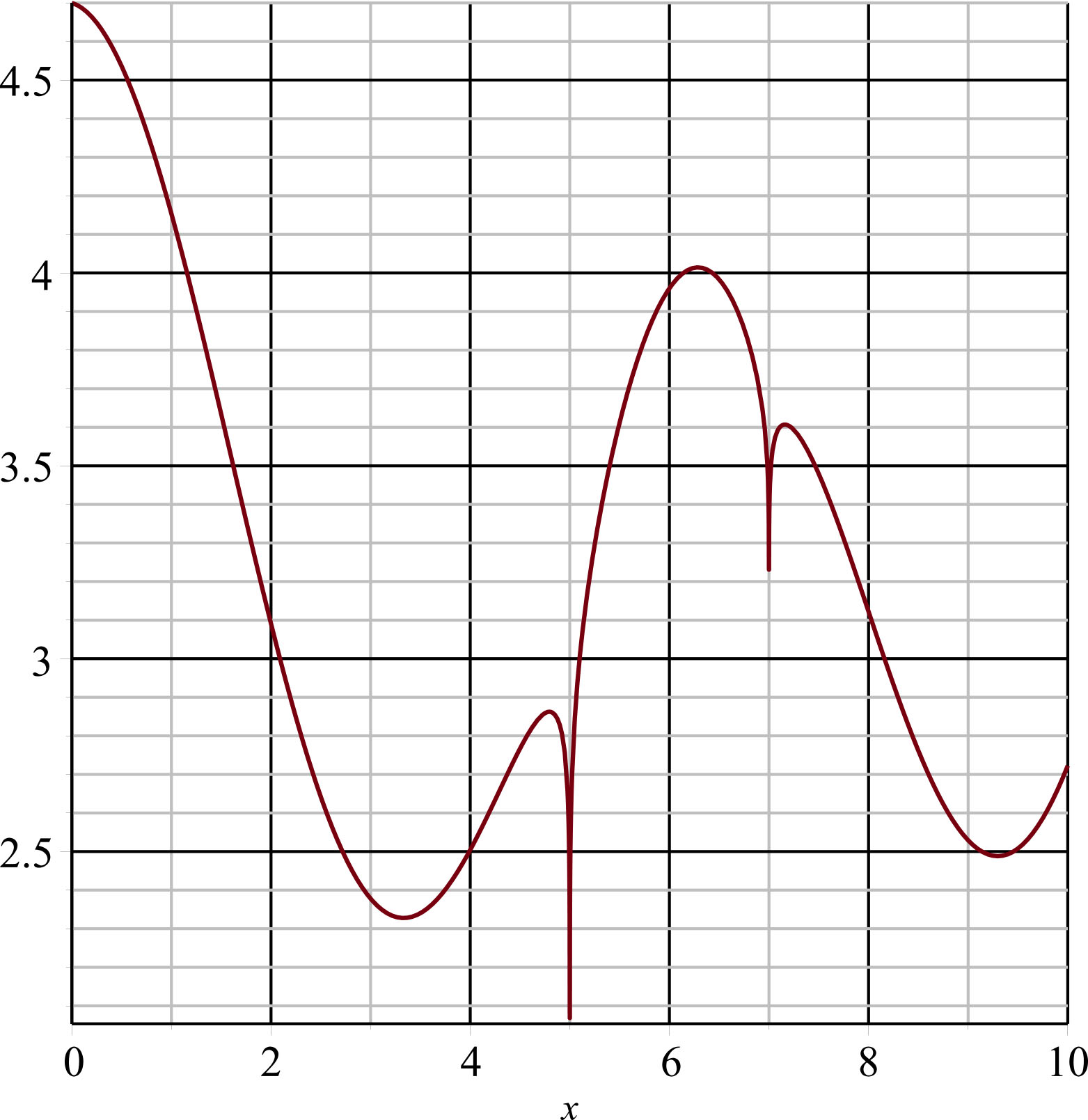 $$f(x)=\cos(x)+\left|(7-x)^{2/15}\right|+2\left|(5-x)^{4/35}\right|$$
