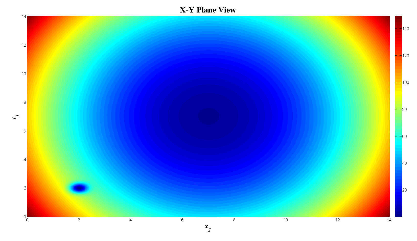 $$f(X)=\left[1-\left|\frac{\sin\left[\pi\left(x_1-2\right)\right]\sin\left[\pi\left(x_2-2\right)\right]}{\pi^2\left(x_1-2\right)\left(x_2-2\right)}\right|^5\right] \times \left[2+\left(x_1-7\right)^2+2\left(x_2-7\right)^2\right]$$