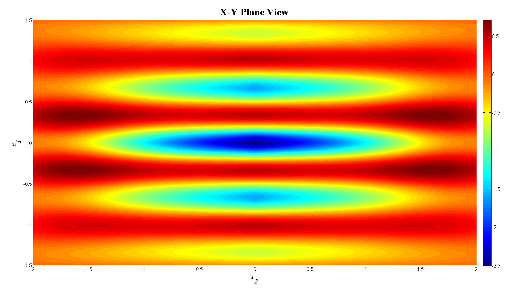 $$f(X)=-\frac{3-\left|x_1\right|}{2}.\frac{2-\left|x_2\right|}{2}.\sin\left(2.2 \pi x_1 + 0.5 \pi\right)-\frac{2-\left|x_1\right|}{2}.\frac{2-\left|x_2\right|}{2}.\sin\left(0.5 \pi x^2_2 + 0.5 \pi\right)$$