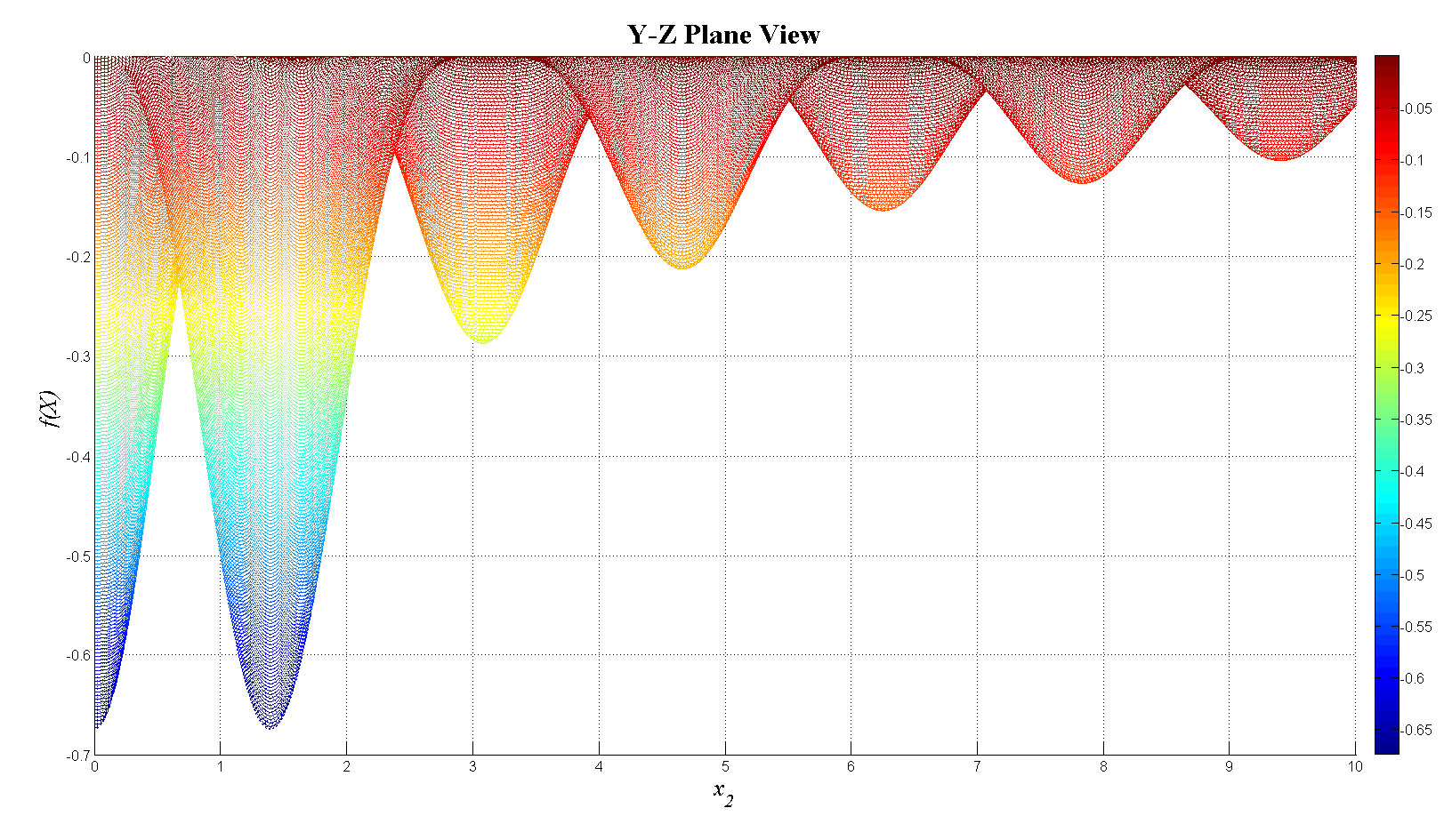 mesh(x1,x2,f_tot);view(0,0);colorbar;set(gca,'FontSize',12);