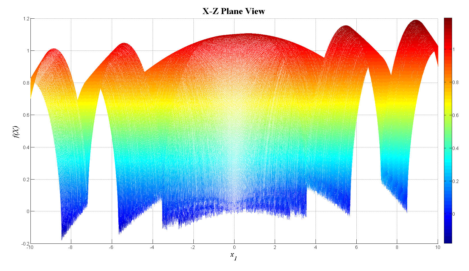 \(\bullet\) This function is firstly presented in [1] as a "New Function No.01". Because there are already functions named "Mishra's Function No.01 and No.02" (see \(n-\)dimensional benchmark functions), so this new function is re-named as "Mishra's Function No.03" [2, 3].
