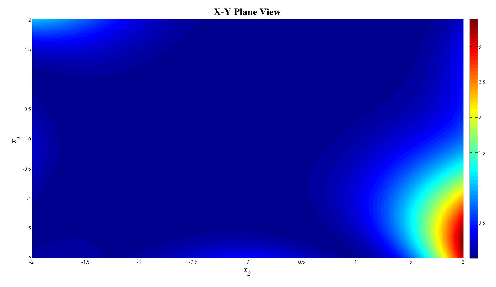 mesh(x1,x2,f_tot);view(90,0);colorbar;set(gca,'FontSize',12);