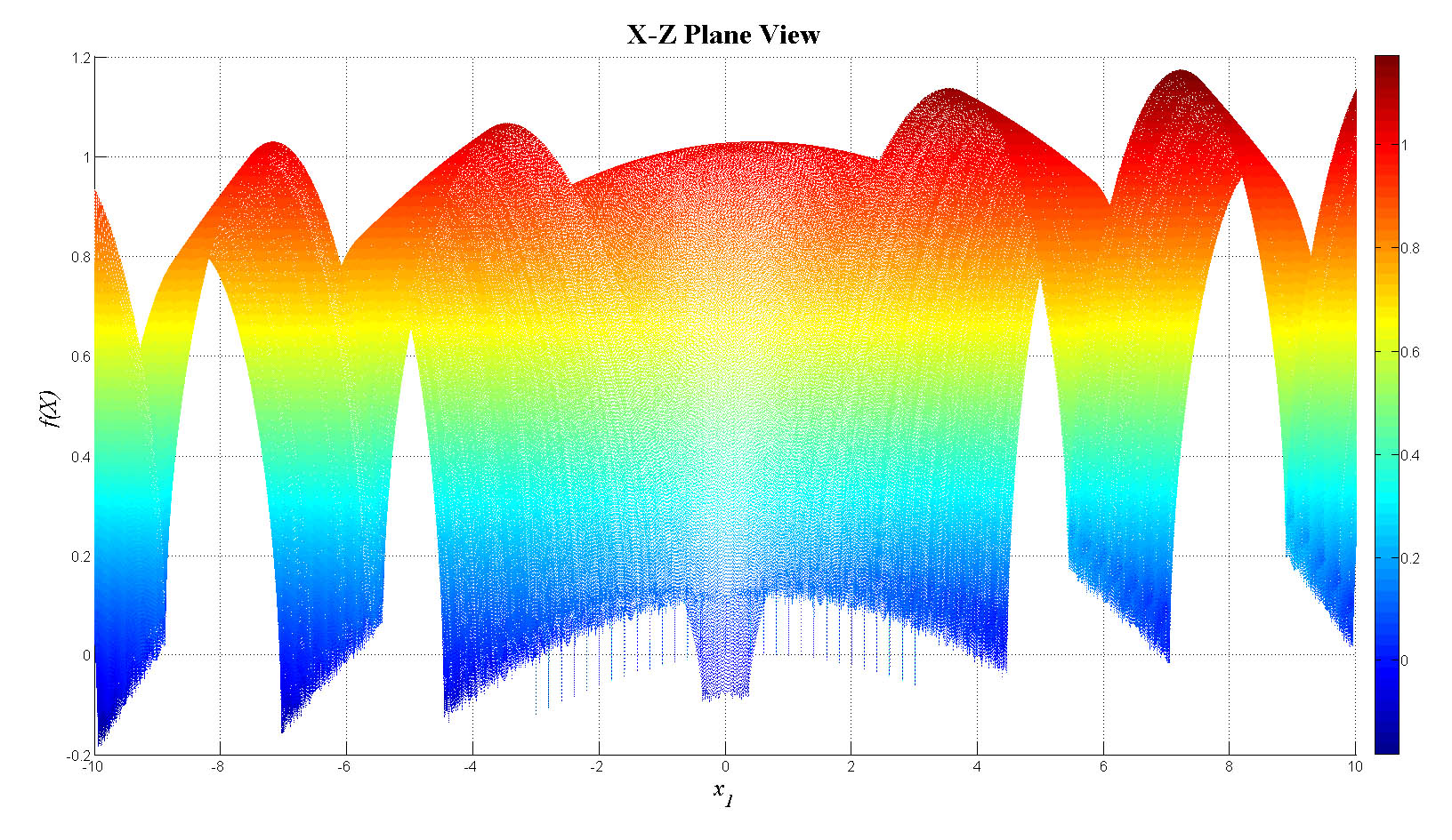 mesh(x1,x2,f_tot);view(0,0);colorbar;set(gca,'FontSize',12);