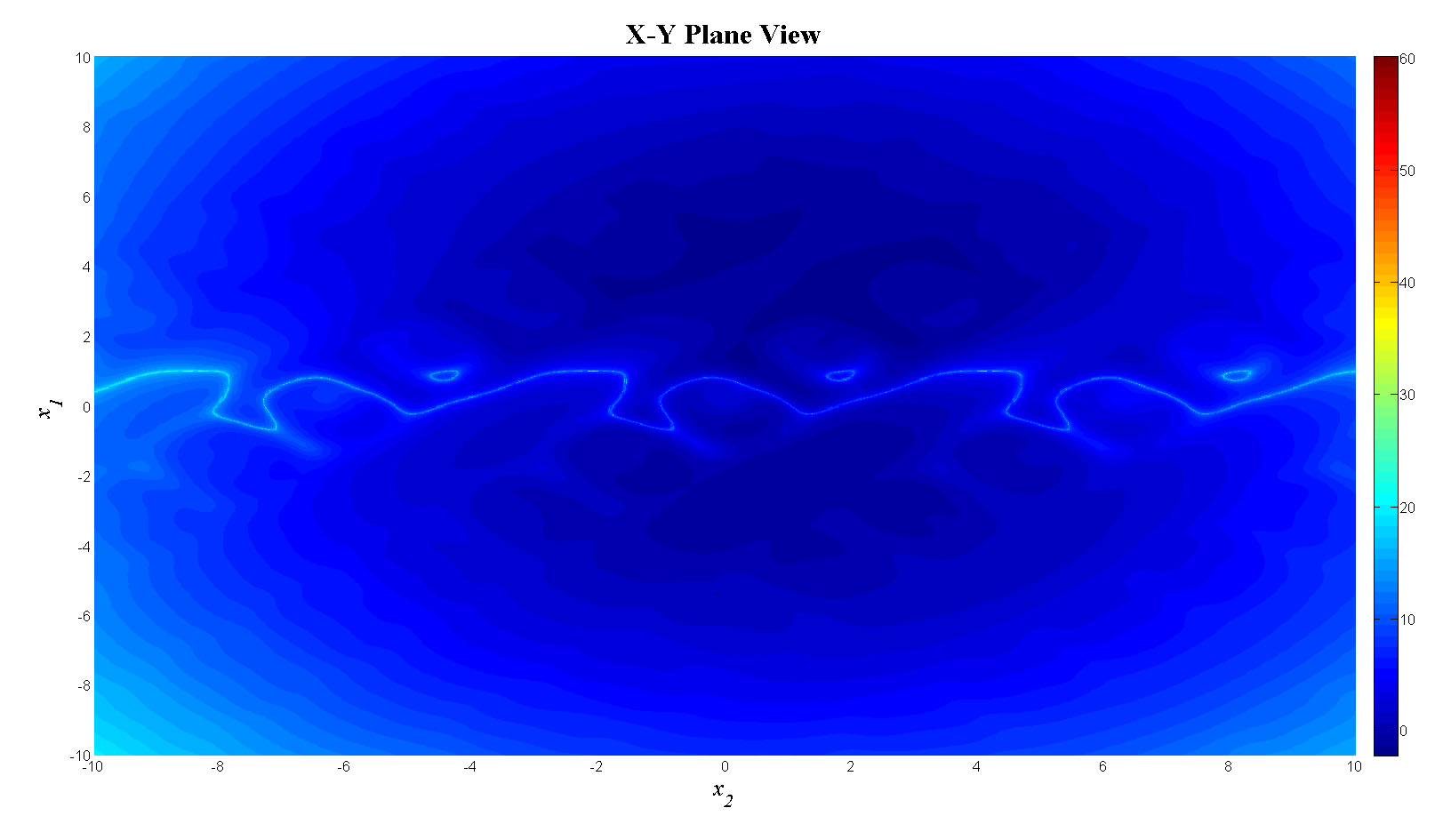 \(\bullet\) \(f_1(X)=\sin^2\left(\left[\cos\left(x_1\right)+\cos\left(x_2\right)\right]^2\right)\)