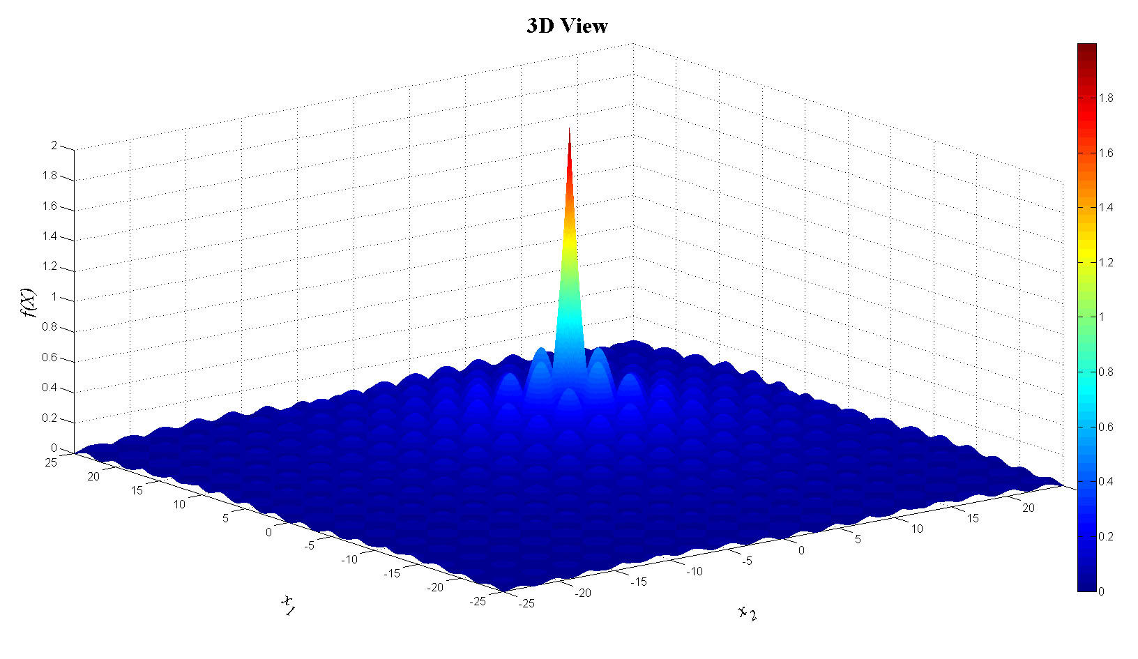 $$f(X)=\frac{\displaystyle \sin\left(x_1-\frac{x_2}{8}\right)^2+\sin\left(x_2+\frac{x_1}{8}\right)^2}{\displaystyle \sqrt{\left(x_1-\frac{36}{13}\pi\right)^2+\left(x_2-\frac{28}{13}\pi\right)^2}+1}$$
