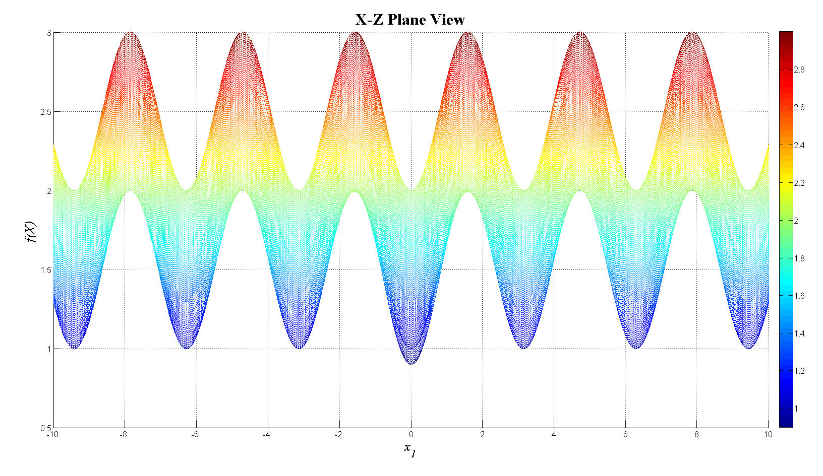 $$f(X)=1+\sin^2\left(x_1\right)+\sin^2\left(x_2\right)-0.1e^{\left(-x_1^2-x_2^2\right)}$$