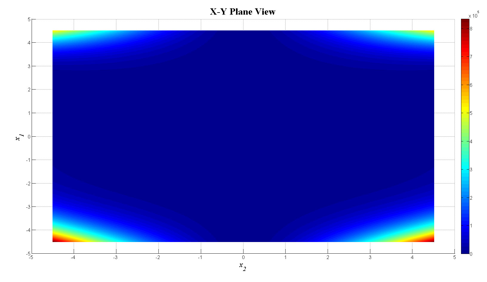 mesh(x1,x2,f_tot);view(0,90);colorbar;set(gca,'FontSize',12);