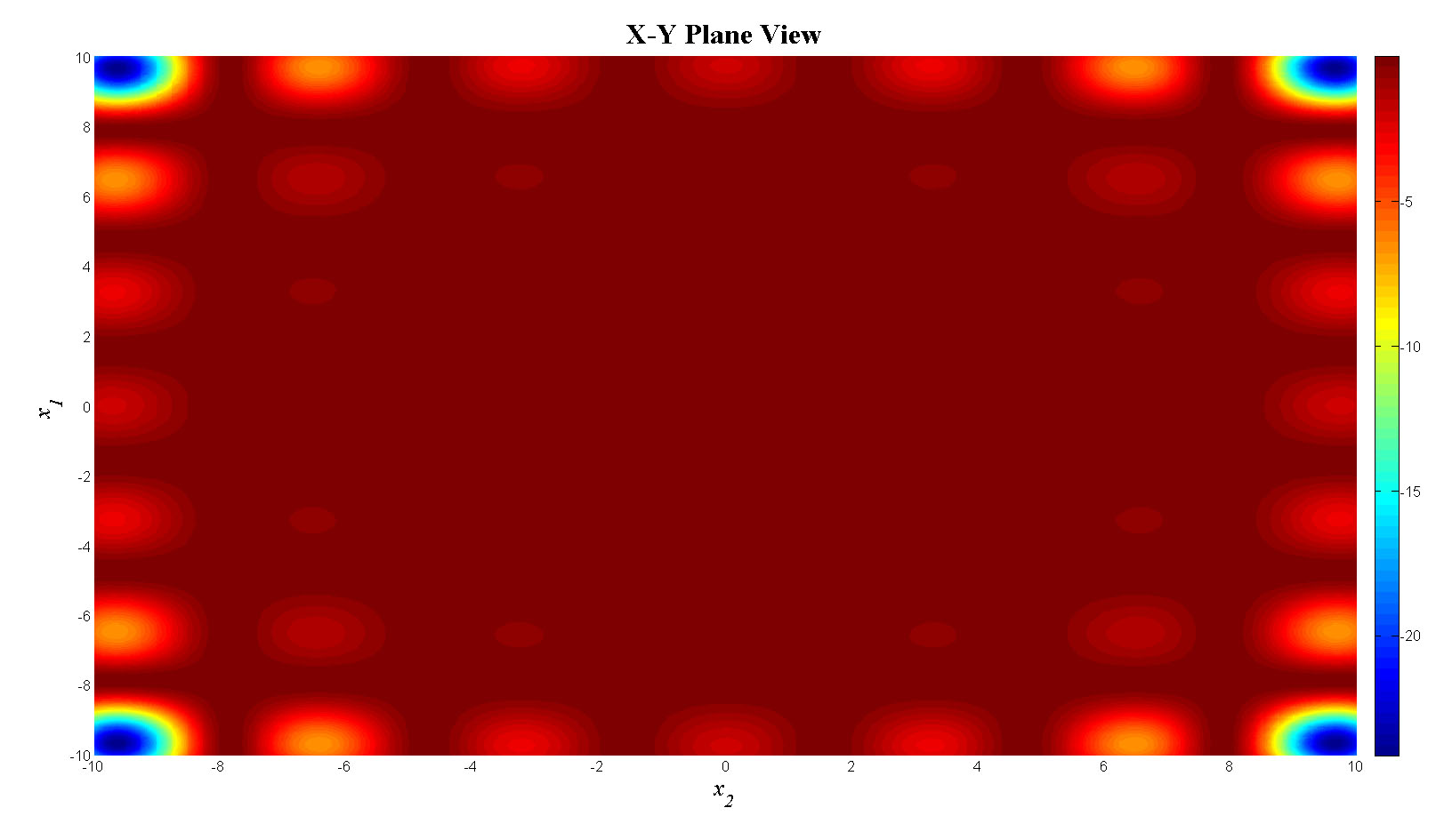 mesh(x1,x2,f_tot);view(0,0);colorbar;set(gca,'FontSize',12);