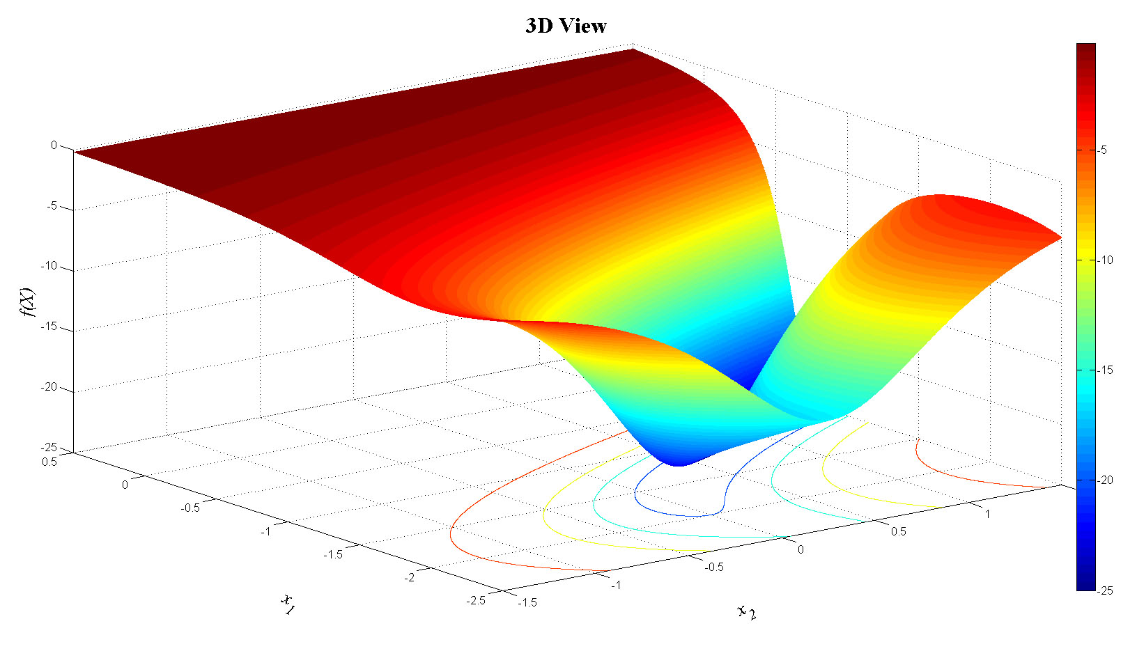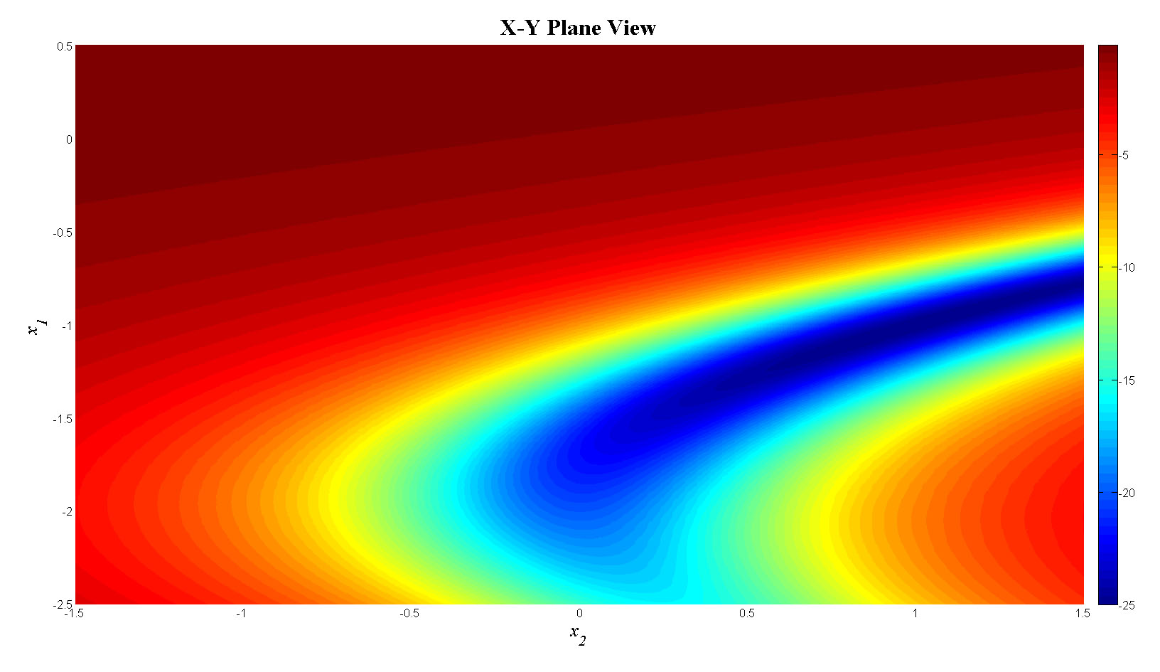 $$f(X)=\frac{-100}{10\left[(x_1+1)^2-(x_2+1)^2\right]+x^2_1+4}$$