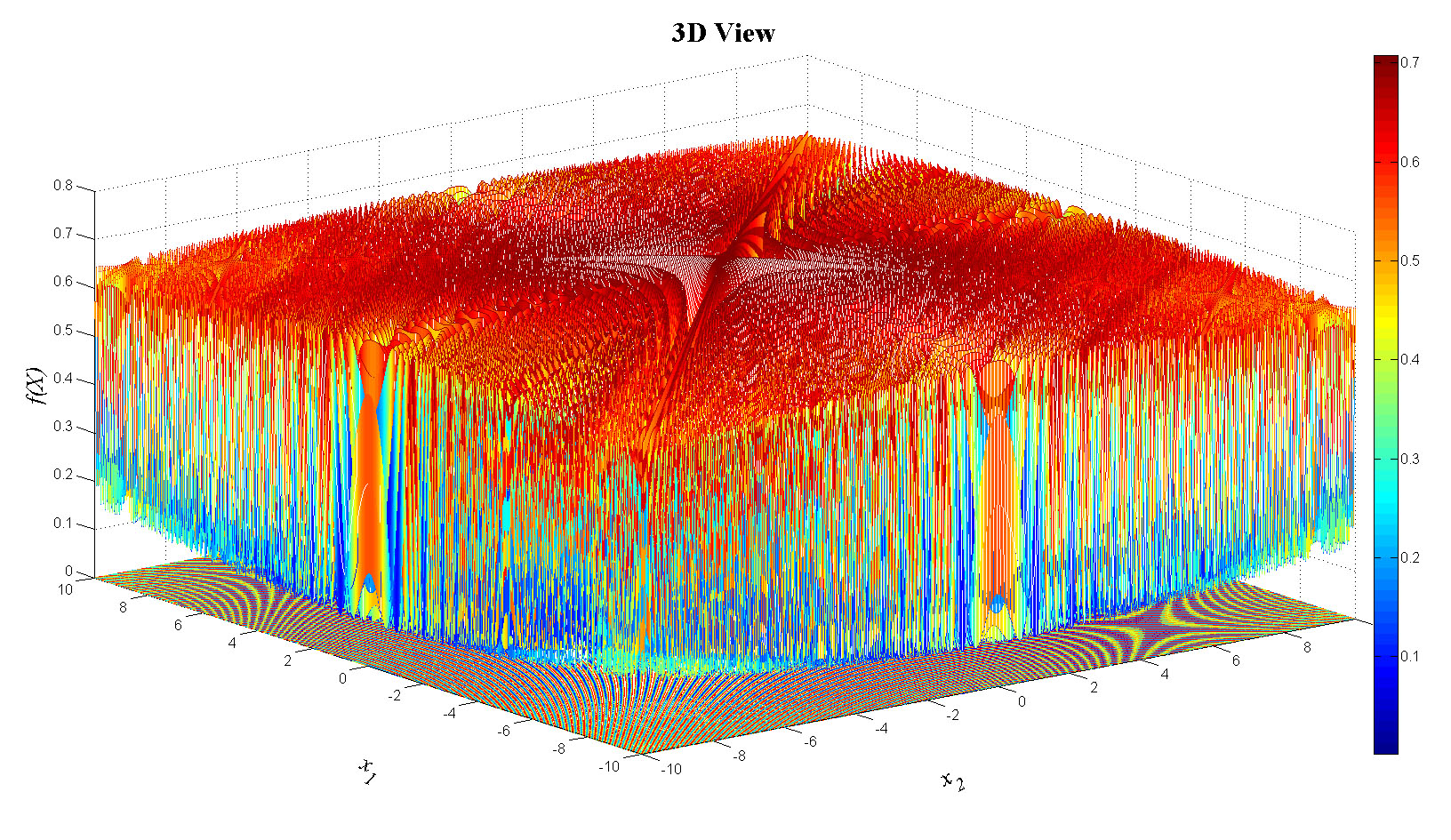 $$f(X)=0.5+\frac{\sin^2\left[\cos\left(\left|x^2_1-x^2_2\right|\right)\right]-0.5}{\left[1+0.001\left(x^2_1+x^2_2\right)\right]^2}$$