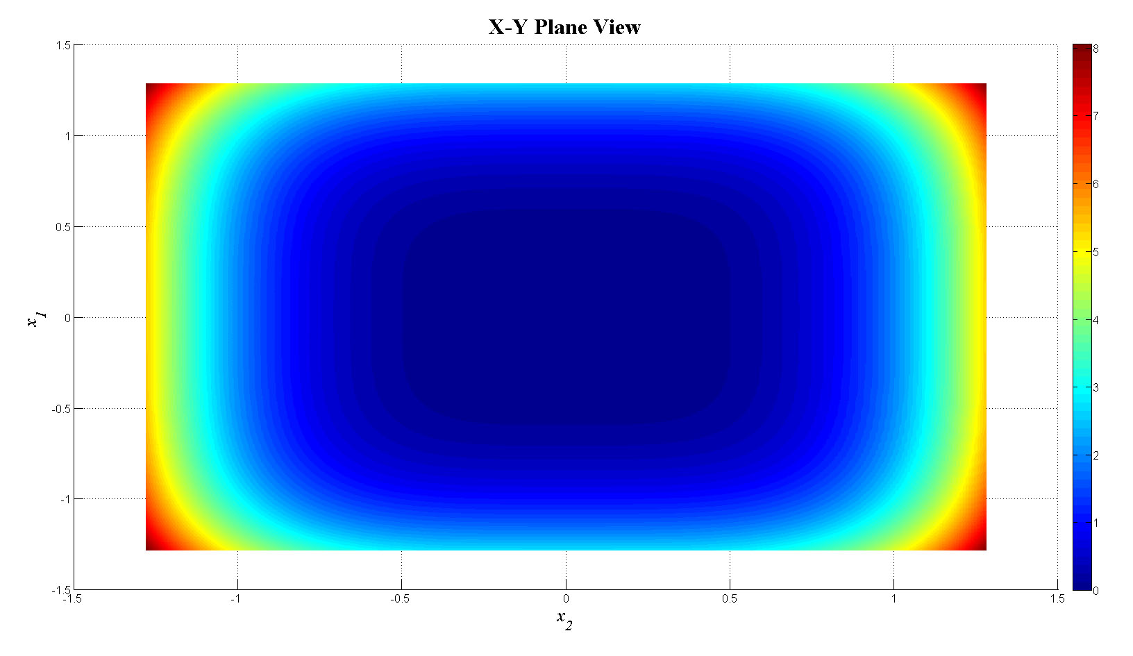 mesh(x1,x2,fn_tot);view(90,0);colorbar;set(gca,'FontSize',12);