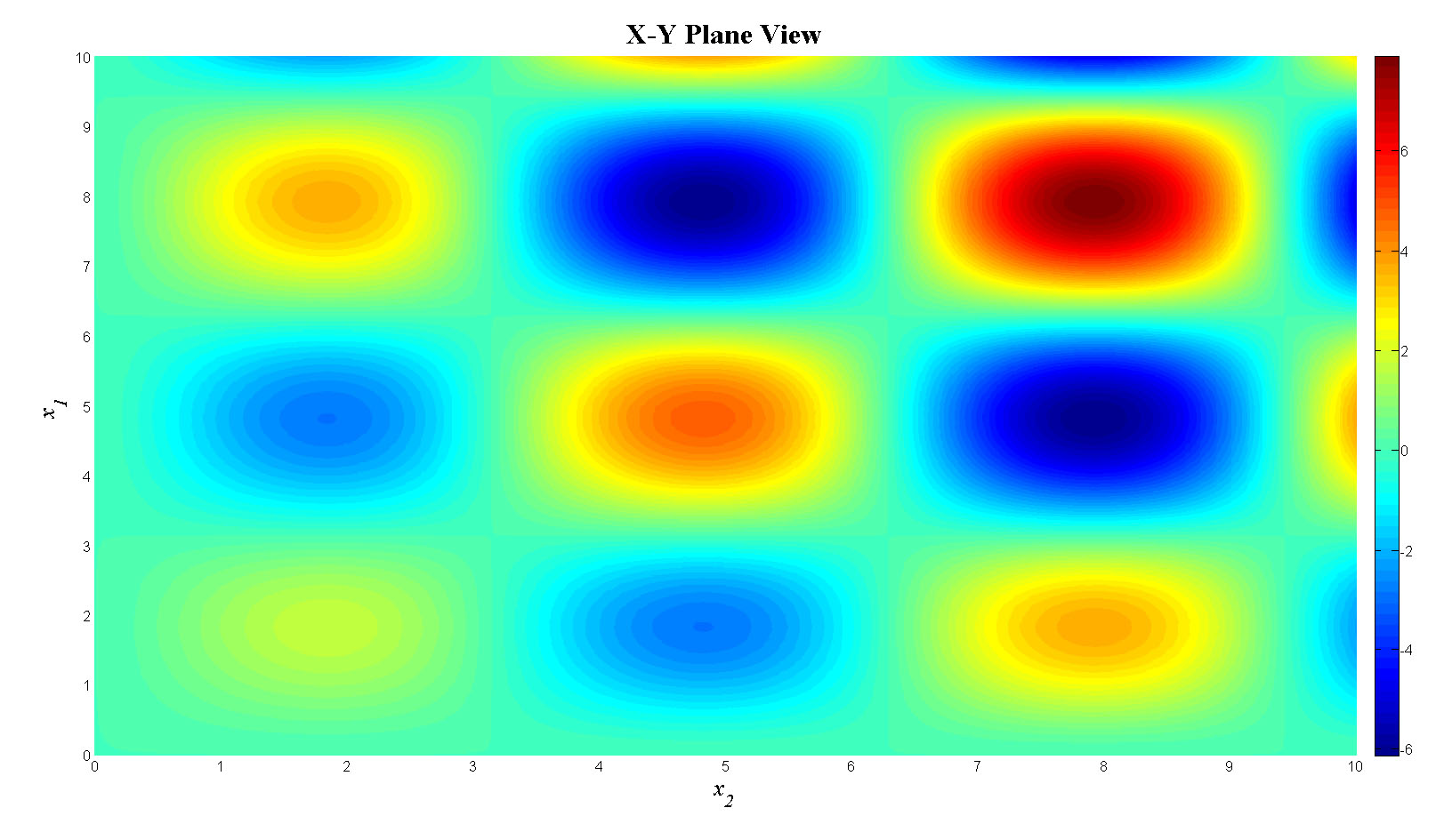 mesh(x1,x2,fn_tot);view(90,0);colorbar;set(gca,'FontSize',12);