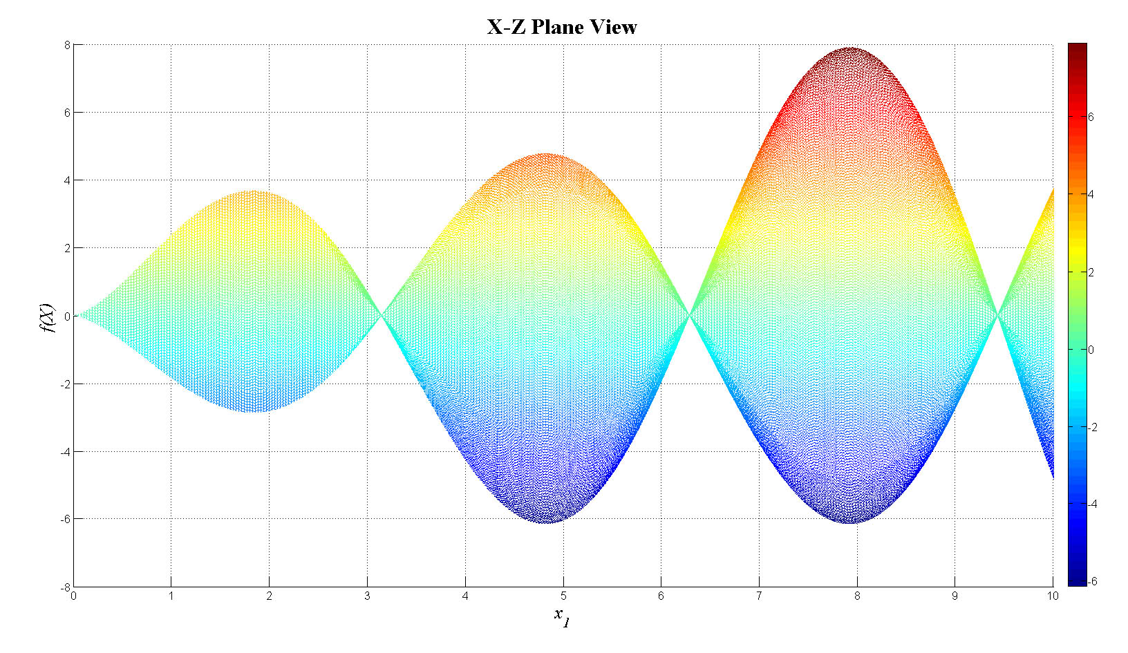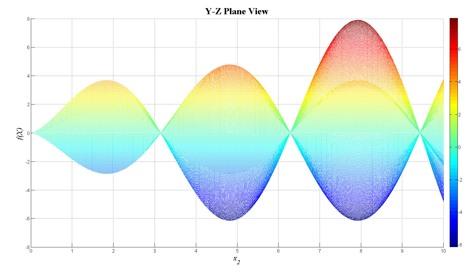 mesh(x1,x2,fn_tot);view(0,0);colorbar;set(gca,'FontSize',12);