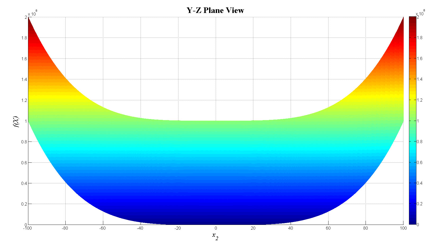 mesh(x1,x2,fn_tot);view(0,0);colorbar;set(gca,'FontSize',12);