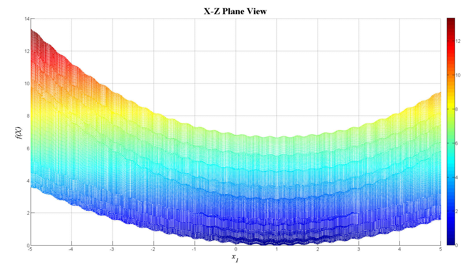 mesh(x1,x2,f_tot);view(0,0);colorbar;set(gca,'FontSize',12);