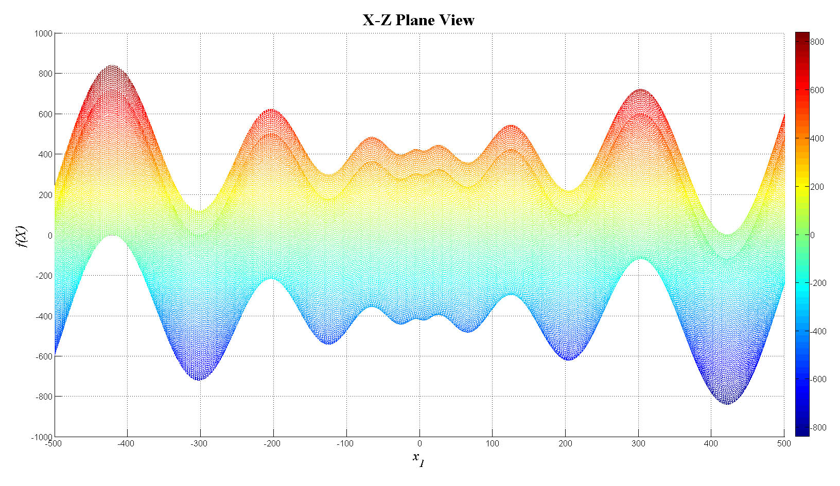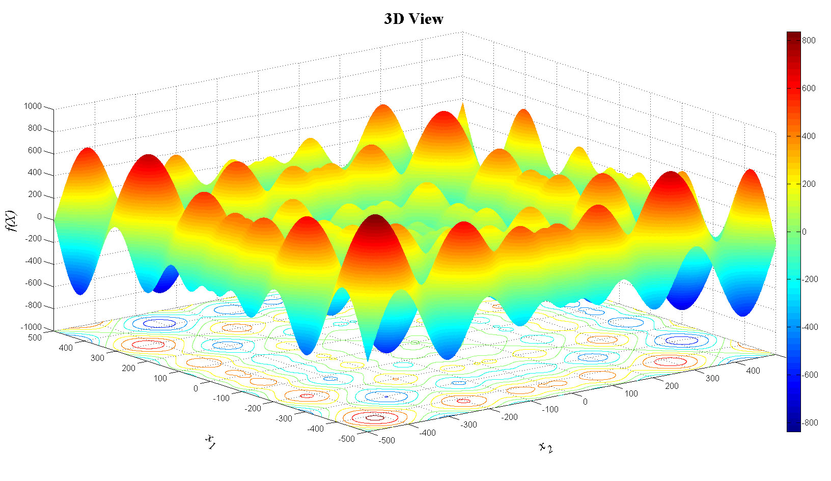 $$f(X)=-\sum_{i=1}^{n}\left[x_i\sin\left(\sqrt{\left|x_i\right|}\right)\right]$$