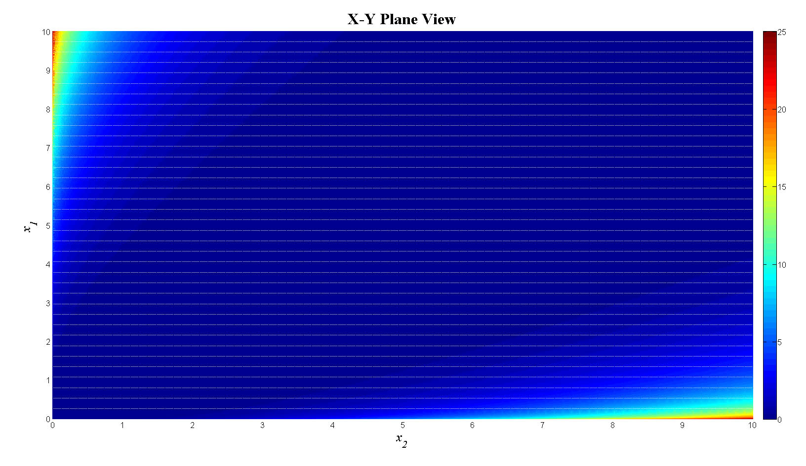 mesh(x1,x2,f_tot);view(0,0);colorbar;set(gca,'FontSize',12);