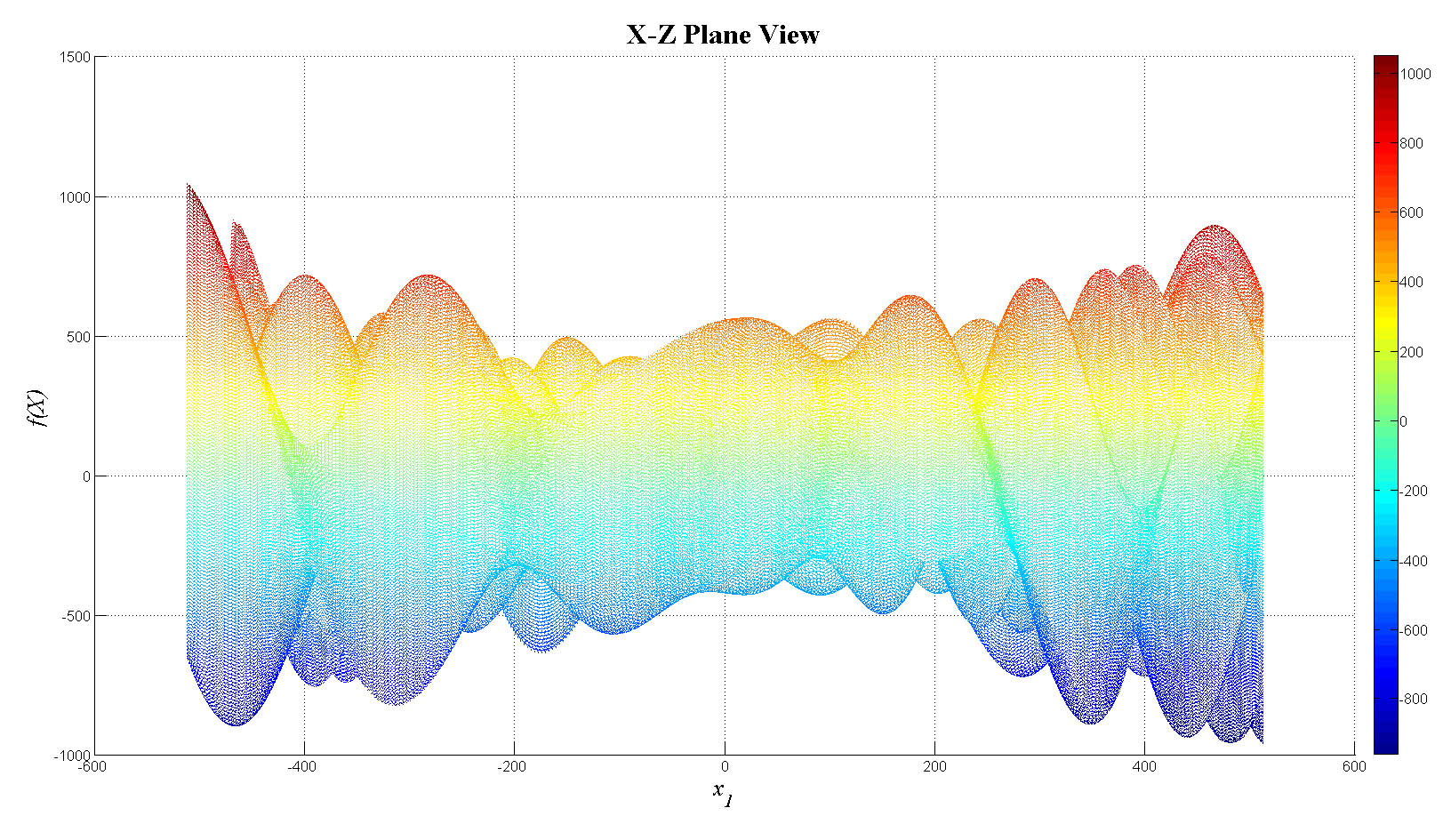 $$f(X)=\sum_{i=1}^{n-1}\left[-x_i\sin\left(\sqrt{\left|x_i-x_{i+1}-47\right|}\right)-\left(x_{i+1}+47\right)\sin\left(\sqrt{\left|0.5x_i+x_{i+1}+47\right|}\right)\right]$$