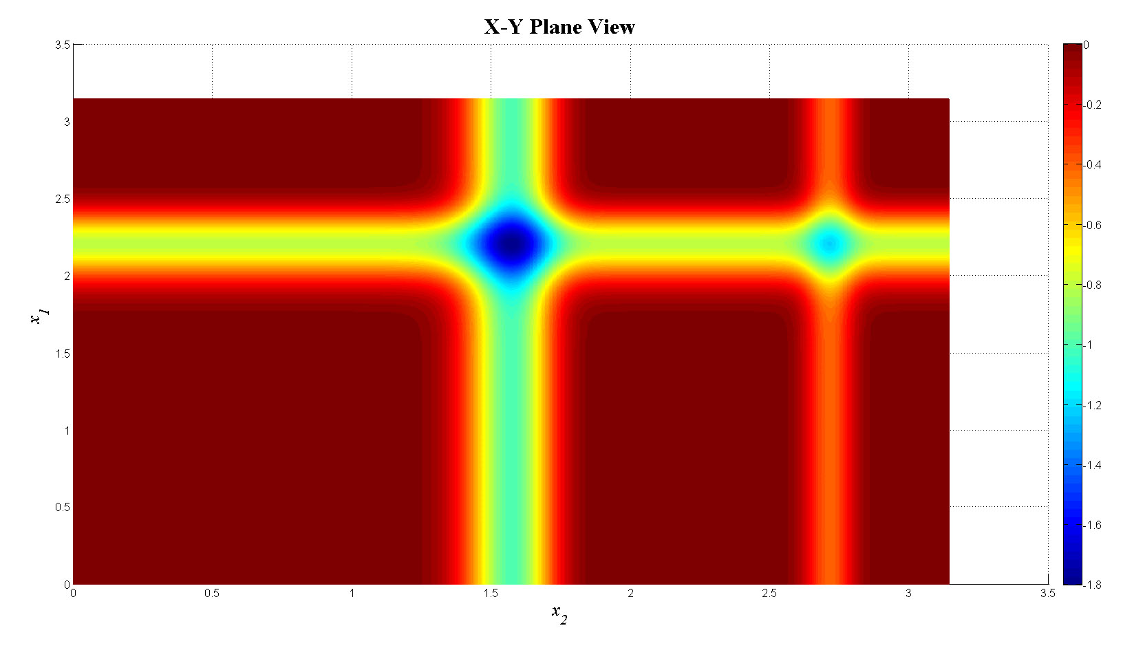 mesh(x1,x2,fn_tot);view(90,0);colorbar;set(gca,'FontSize',12);